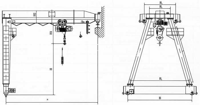 1、BMH型電動葫蘆半門式起重機與CD, MD, HC等型號的電動葫蘆配套使用。是車間內(nèi)外互用場所和多風地區(qū)的輕型有軌運行的小型起重機,起重量Gn=2t-10t,跨度10m-30m,工作環(huán)境+40℃以下,工作級別25%,風壓不大于125Pa。